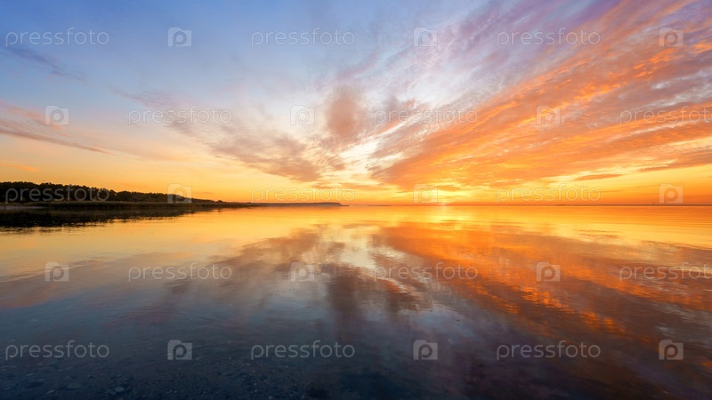 Оранжевый закат на тихом озере, закат отражается в спокойной воде
