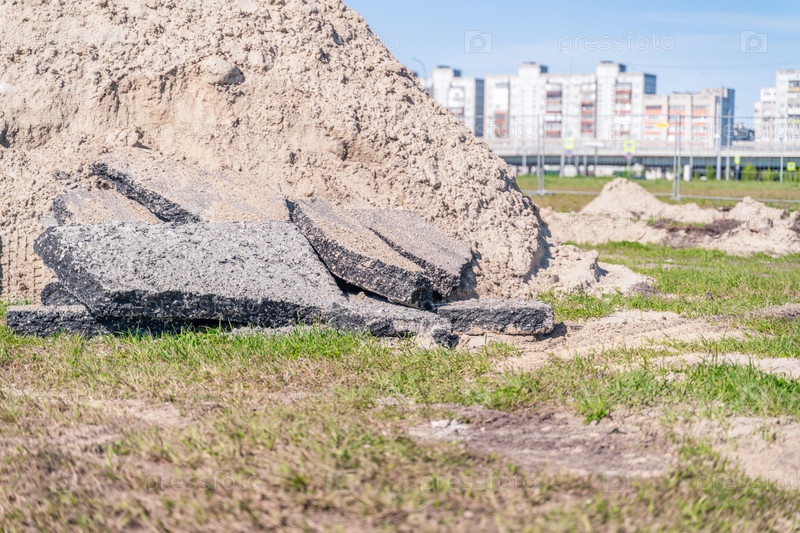 Строительные работы в городе, большая куча земли, городской пейзаж на заднем плане
