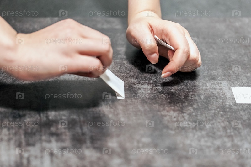 Женские руки отрывают наклейку от деревянной поверхности