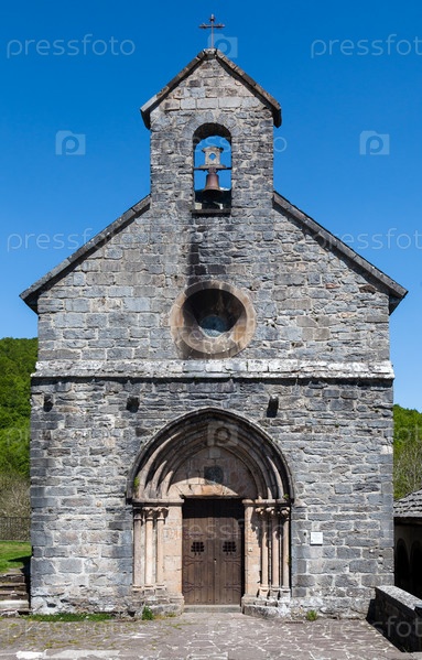 Колокола звонят в тихой каменной часовне в Ронсево на Камино де Сантьяго, французские Пиренеи