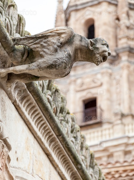 Горгулья, возвышающаяся над исторической архитектурой Саламанки, Испания