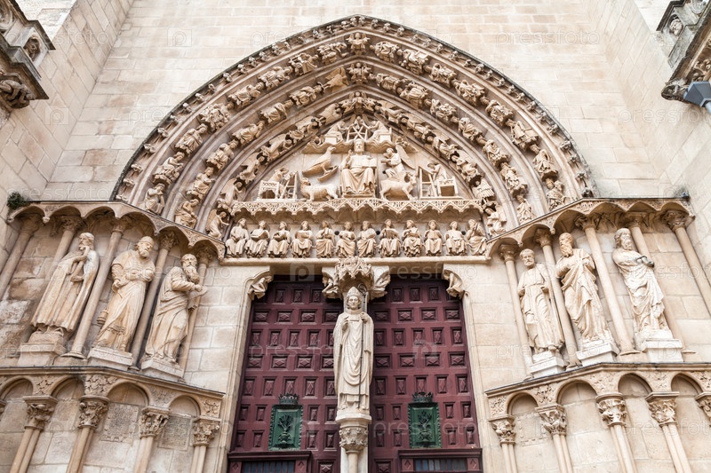 Детализированный каменный фасад собора в Бургосе, Испания, с его готическими произведениями искусства