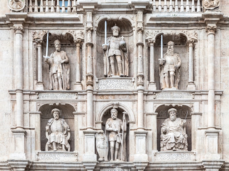 Исторические каменные скульптуры монархов, держащих мечи, на Арке Санта-Мария в Бургосе, Испания