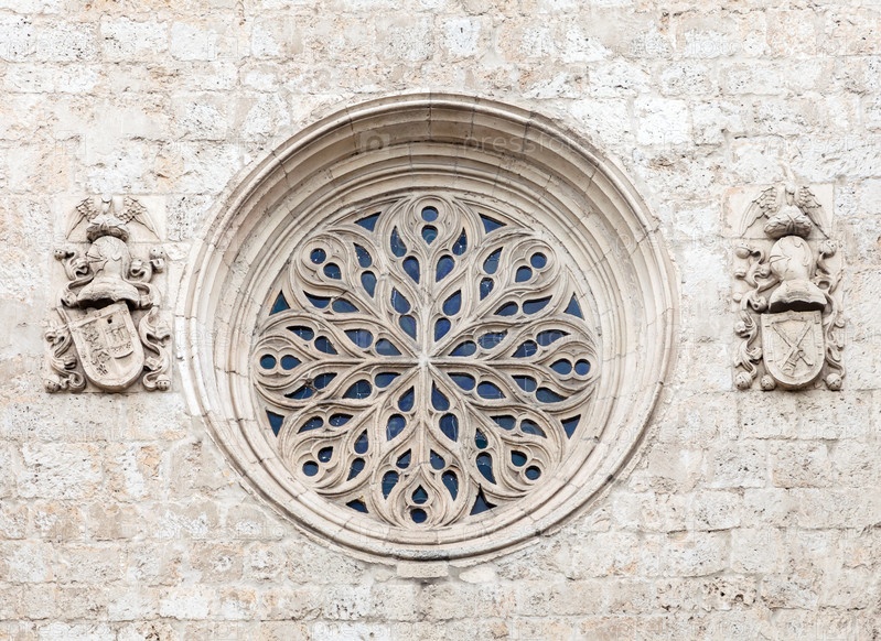 Изысканное розовое окно демонстрирует уникальные узоры и яркие цвета в церкви Iglesia la Merced в Бургосе