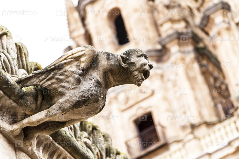 Подробный вид горгульи, возвышающейся на историческом здании в Саламанке, отражающей богатое наследие города