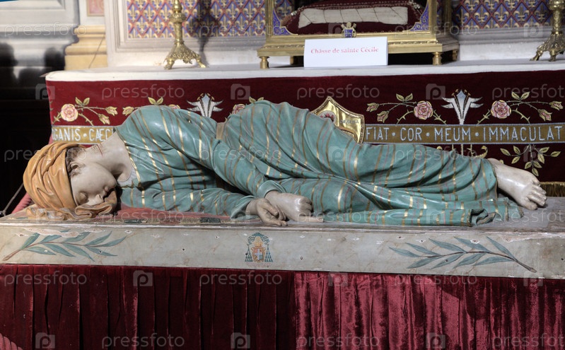 Святая Сесиль спокойно покоится в своей богато украшенной гробнице в соборе Альби, отражая художественное мастерство и историю