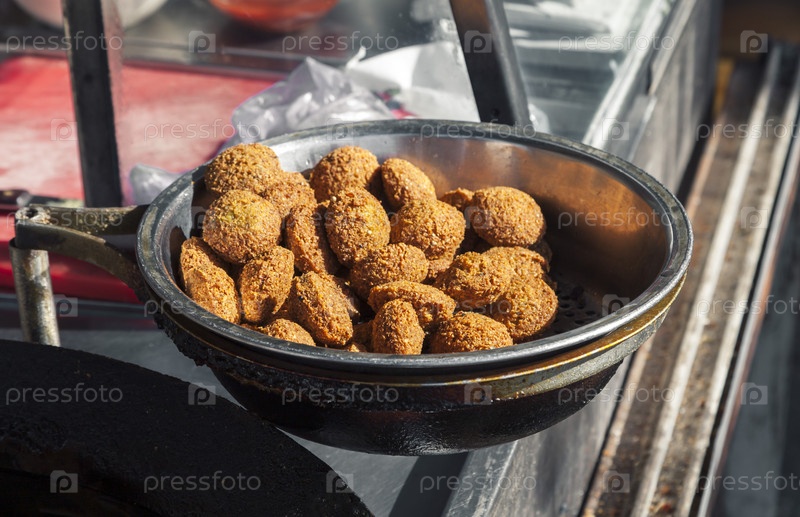 Золотистые шарики фалафеля остывают в миске на прилавке уличного торговца
