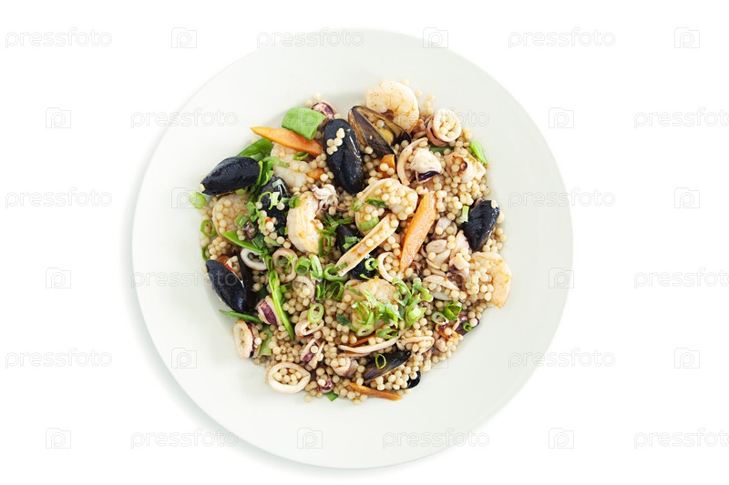 Вкусный салат из морепродуктов со свежими овощами и киноа