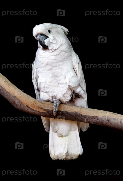 Белый попугай сидит на ветке на черном фоне.Большой белокожий какаду (лат.: Cacatua alba, =Plyctolophus alba)