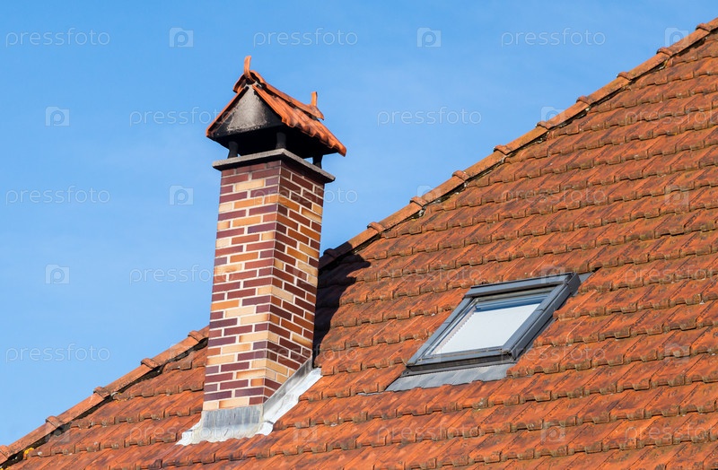 На крыше находится традиционный кирпичный дымоход и современный световой люк на фоне ярко-синего неба