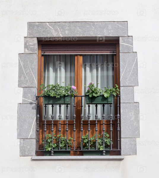 В деревенском здании есть деревянное окно с открытыми ставнями и цветочный ящик, полный ярких цветов