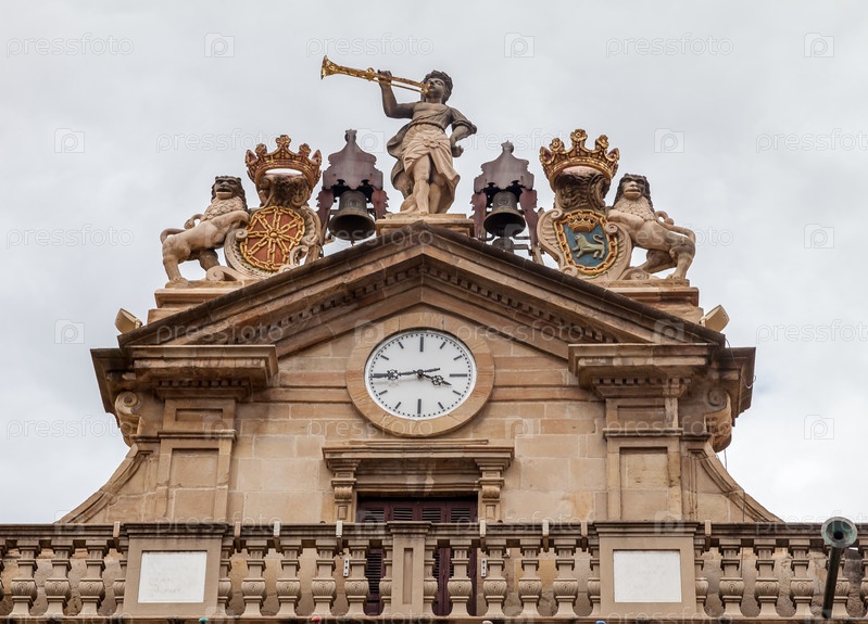 Здание мэрии Памплоны представляет собой образец сложной архитектуры, украшенной флагами и скульптурами под облачным небом