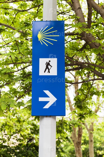 Знак, обозначающий паломнический маршрут Камино де Сантьяго в пышной лесной местности при ярком дневном свете