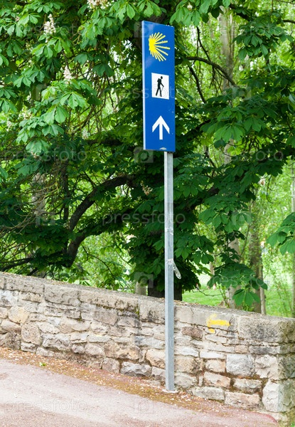 Указатель направляет паломников по Камино де Сантьяго, окруженному зеленью и деревьями при дневном свете