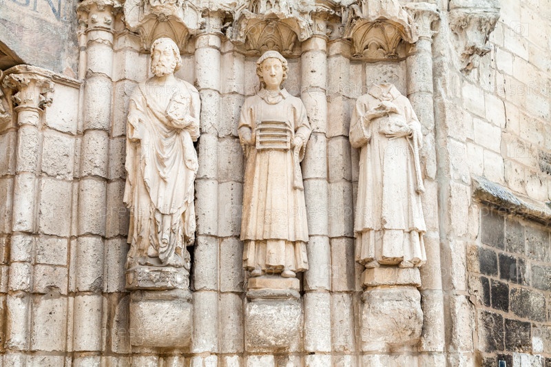 Изящные каменные скульптуры религиозных деятелей дополняют архитектуру церкви Сан-Эстебан в Бургосе, Испания
