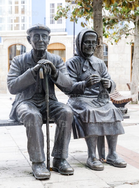 БУРГОС, ИСПАНИЯ - 29 мая 2016 г. - Эти бронзовые статуи изображают пожилую пару, сидящую на скамейке