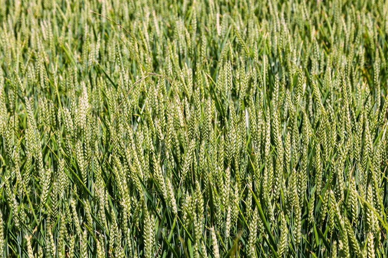 Пшеничное поле в полдень демонстрирует яркие зеленые колосья, покачивающиеся на легком ветру