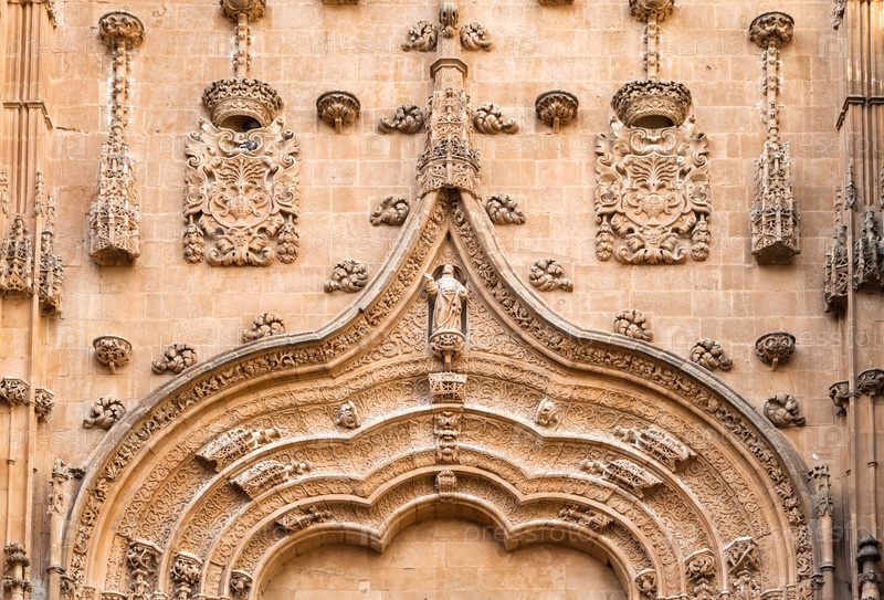 Изысканная резьба по камню украшает вход в исторический собор в Саламанке, Испания
