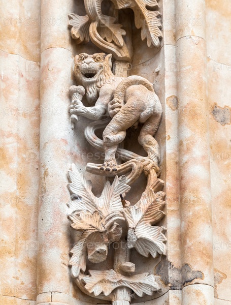 Детализированная резьба по камню изображает мифическое существо, восседающее на вершине колонны в Саламанке, что свидетельствует о богатом наследии