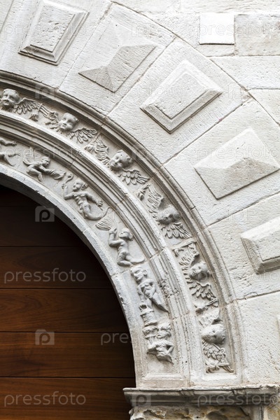 Подробные рельефные скульптуры изображают различные фигуры вдоль арки исторического входа в город