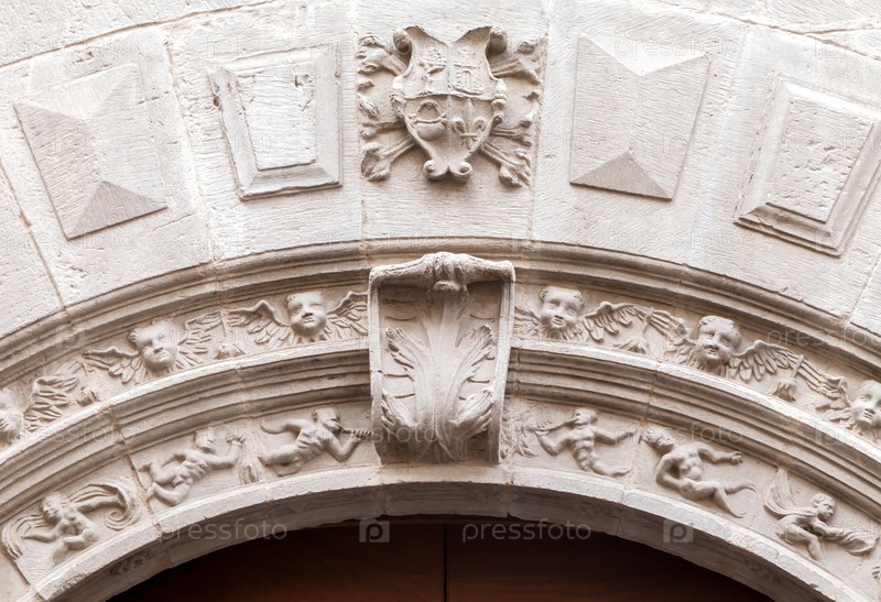 На сложной резной арке изображены ангелы и герб, демонстрирующие тонкое мастерство той исторической эпохи