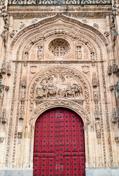 Богато украшенный вход в Саламанкский собор украшен замысловатой резьбой и яркой красной дверью, подчеркивающей его архитектурную красоту