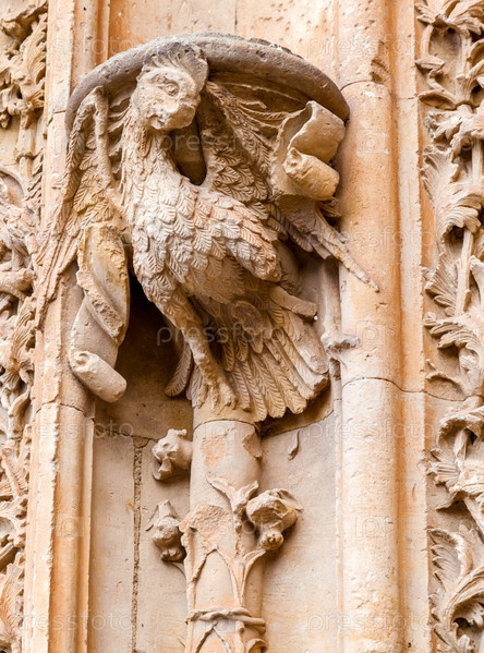 Детальная резьба по камню изображает мифическое существо, восседающее на вершине колонны в Саламанке, что свидетельствует о богатом наследии