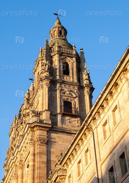 Сложные детали исторической башни в Саламанке красиво подсвечиваются солнечным светом, демонстрируя ее величие