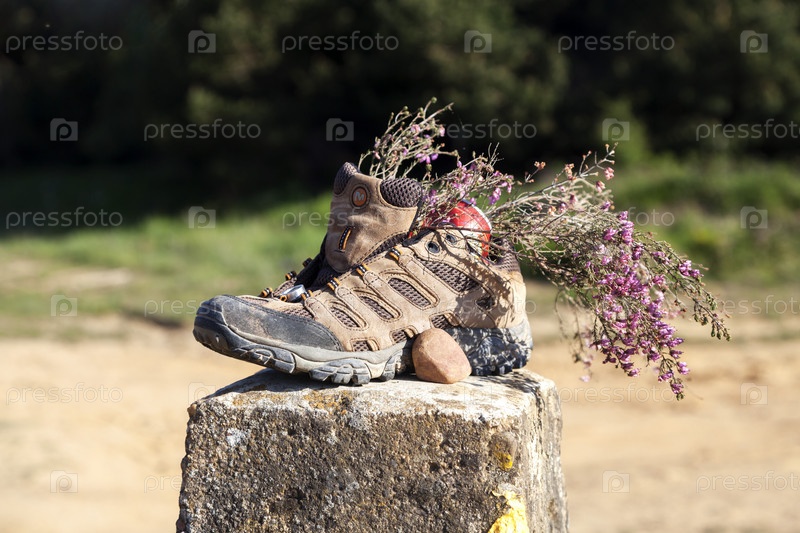 Каменный указатель, украшенный символом ракушки, стоит вдоль маршрута Камино де Сантьяго, а на нем старый треккинговый ботинок