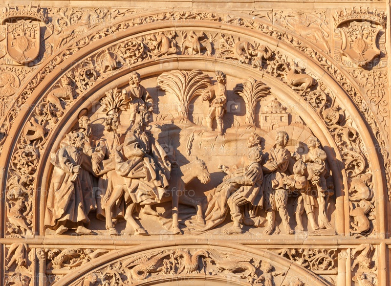 Подробные каменные рельефы изображают исторические сцены в здании Саламанки