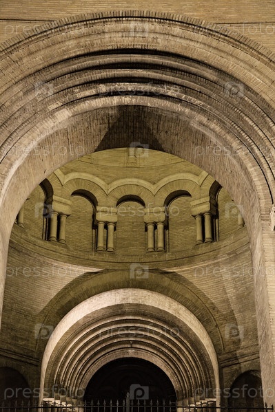 Архитектурные детали исторического сооружения в Тулузе, Франция, арки и колонны ночью