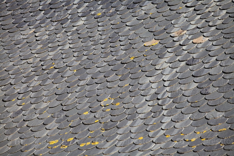 Крупный план сланцевой крыши с уникальными текстурами и цветами в Каркассоне, Франция