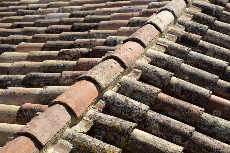 Старая глиняная черепица на крыше демонстрирует уникальный рисунок и эффекты выветривания под ярким солнечным светом в спокойной обстановке