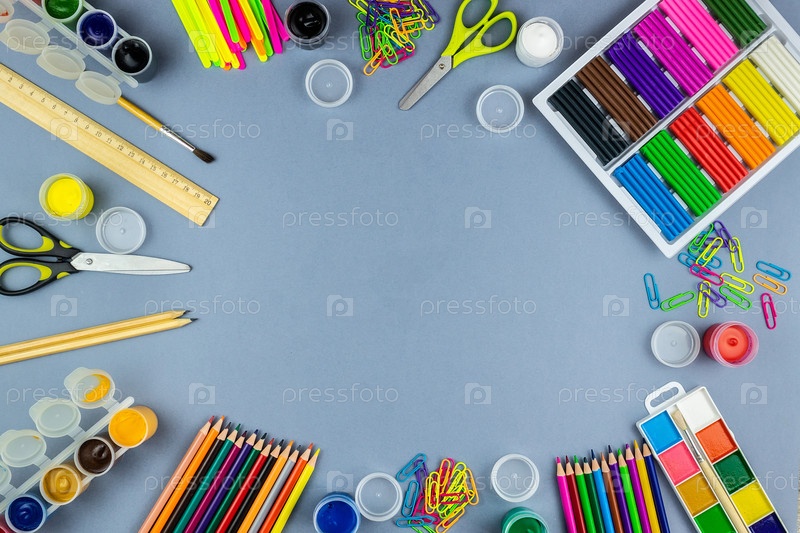 Школьные принадлежности на сером фоне