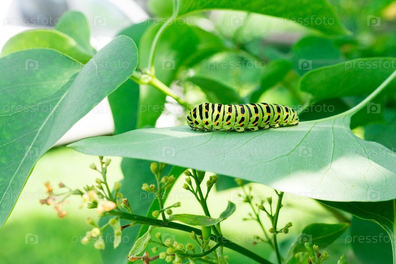 Зеленая гусеница на листе сирени