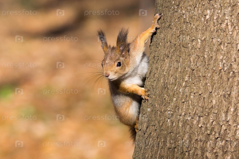 Рыжая белка на ветке осенью