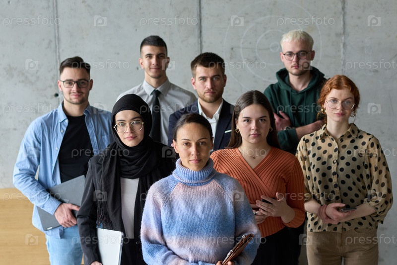 Разнообразная и целеустремленная команда профессионалов бизнеса уверенно стоит в офисе, готовая взяться за новые бизнес-планы и задачи, концентрируясь на успехе и росте