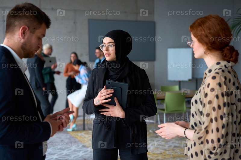 Группа разнообразных деловых людей ведет беседу во время рабочего перерыва в офисе, на заднем плане видны их коллеги, что способствует сотрудничеству и налаживанию связей