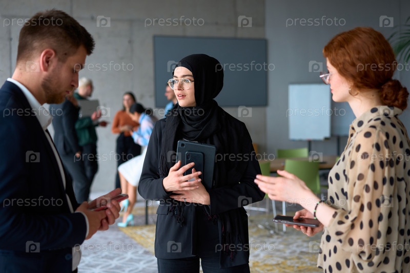 Группа разнообразных деловых людей ведет беседу во время рабочего перерыва в офисе, на заднем плане видны их коллеги, что способствует сотрудничеству и налаживанию связей