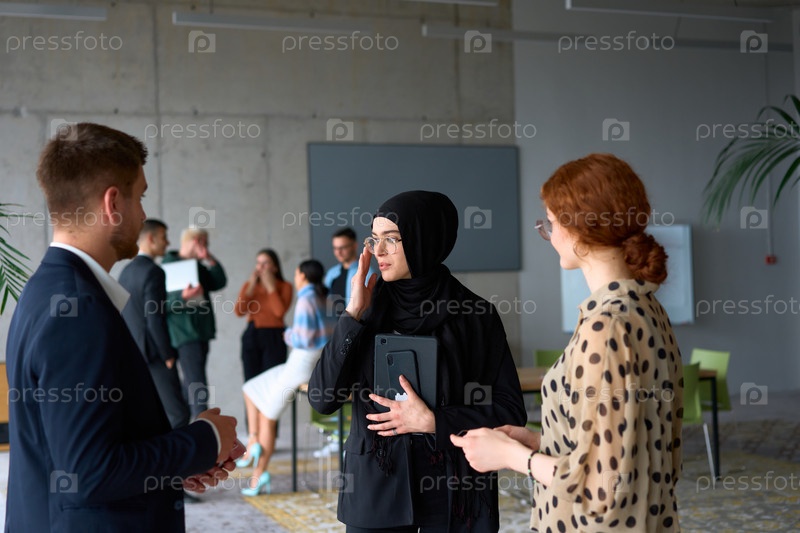 Группа разнообразных деловых людей ведет беседу во время рабочего перерыва в офисе, на заднем плане видны их коллеги, что способствует сотрудничеству и налаживанию связей