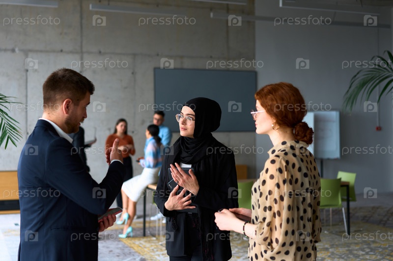 Группа разнообразных деловых людей ведет беседу во время рабочего перерыва в офисе, на заднем плане видны их коллеги, что способствует сотрудничеству и налаживанию связей