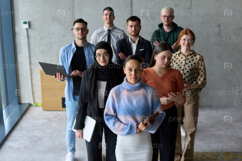 Разнообразная и целеустремленная команда профессионалов бизнеса уверенно стоит в офисе, готовая взяться за новые бизнес-планы и задачи, концентрируясь на успехе и росте