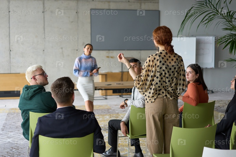 Группа разнообразных деловых людей сосредоточенно сидит в современном офисе, активно участвуя в обучающем занятии под руководством инструктора, уделяя особое внимание последним технологическим достижениям в мире бизнеса