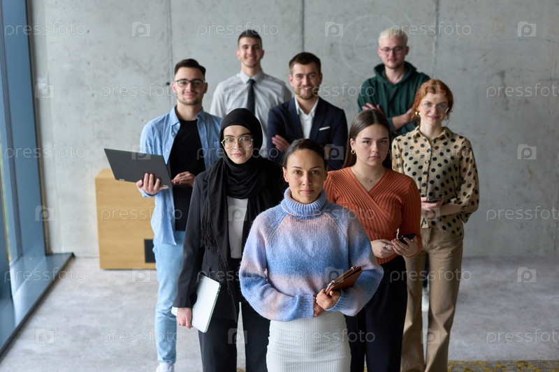 Разнообразная и целеустремленная команда профессионалов бизнеса уверенно стоит в офисе, готовая взяться за новые бизнес-планы и задачи, концентрируясь на успехе и росте