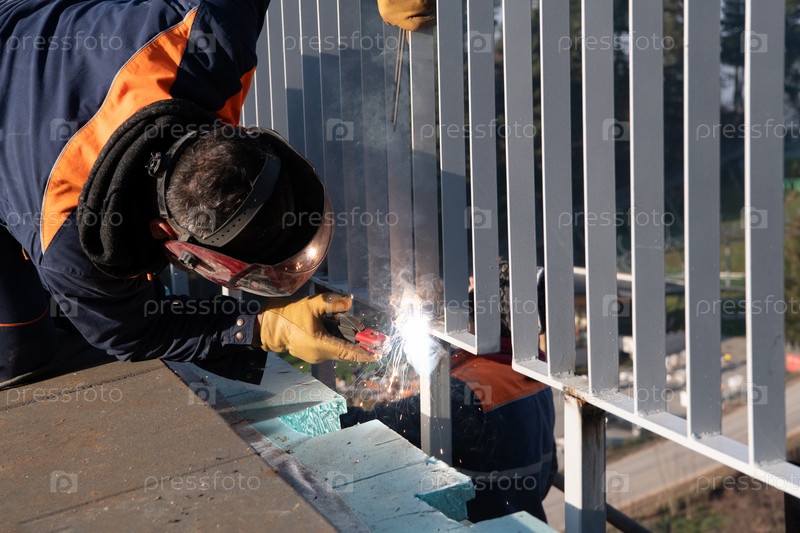 Промышленный сварщик искусно изготавливает металлическое ограждение для нового делового комплекса, используя современное оборудование, высекающее яркие искры и подчеркивающее точность и преданность делу