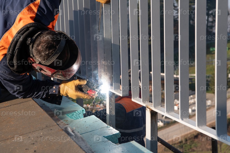 Промышленный сварщик искусно изготавливает металлическое ограждение для нового делового комплекса, используя современное оборудование, высекающее яркие искры и подчеркивающее точность и преданность делу