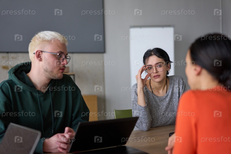 Молодая, разнообразная бизнес-команда сидит вместе в современном офисе, обменивается идеями и бизнес-планами, укрепляя сотрудничество и инновации для будущего успеха