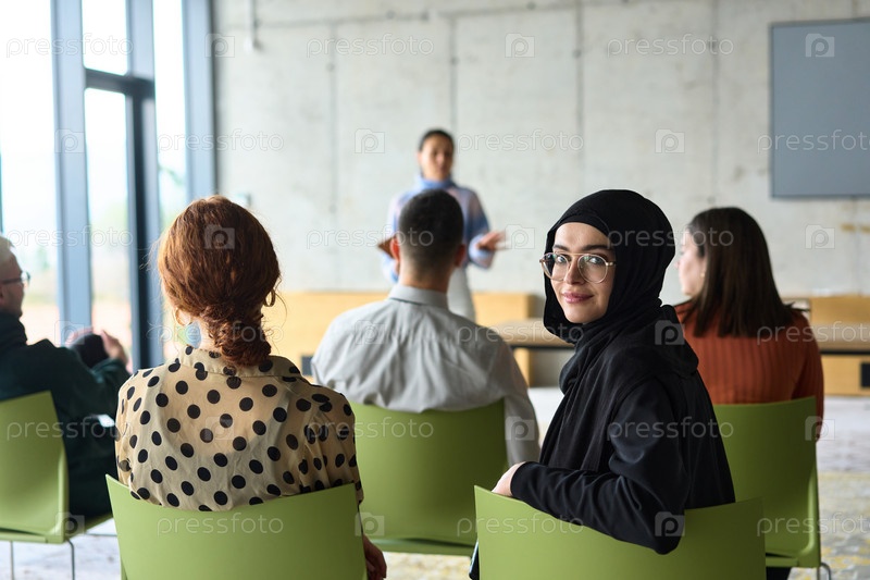 Группа разнообразных деловых людей сосредоточенно сидит в современном офисе, активно участвуя в обучающем занятии под руководством инструктора, уделяя особое внимание последним технологическим достижениям в мире бизнеса