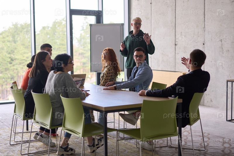 Молодая, разнообразная бизнес-команда сидит вместе в современном офисе, обменивается идеями и бизнес-планами, укрепляя сотрудничество и инновации для будущего успеха