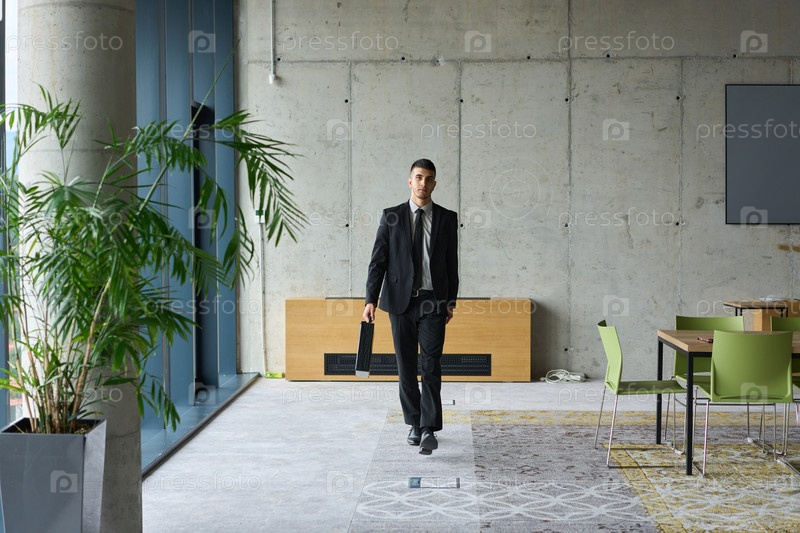 Решительный бизнесмен в черном костюме уверенно идет по офису, олицетворяя профессионализм и сосредоточенность на пути к новым вызовам